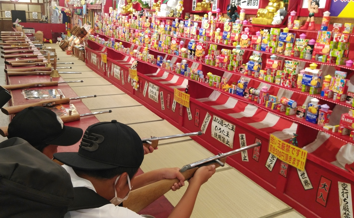 次男坊がスマートボールのお店を見つけて『やりたい❗』って言ったので行ってみたら親同伴でも18歳未満は入場出来ませんって事で射的のお店へ。小さいお菓子を2個ゲット✌️