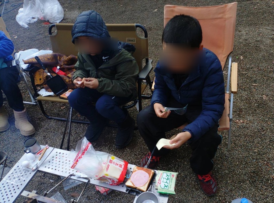 朝から焚き火をしながら子供達がホットサンドを作ってくれました😊他にもベーコンやソーセージなんかを焼いて食べました🥪